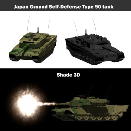 陸上自衛隊の90式戦車の形状データです。砲塔や機関銃等は回転パートを組み込んであります。 砲煙、キャタピラも形状データで作成されています。